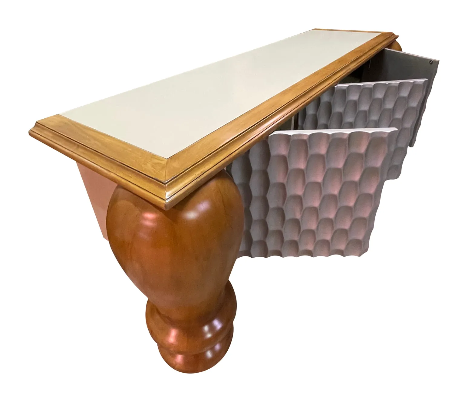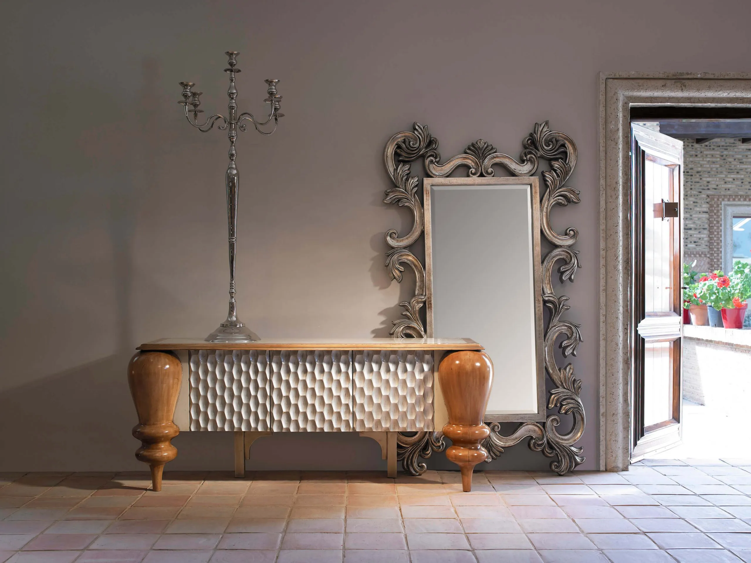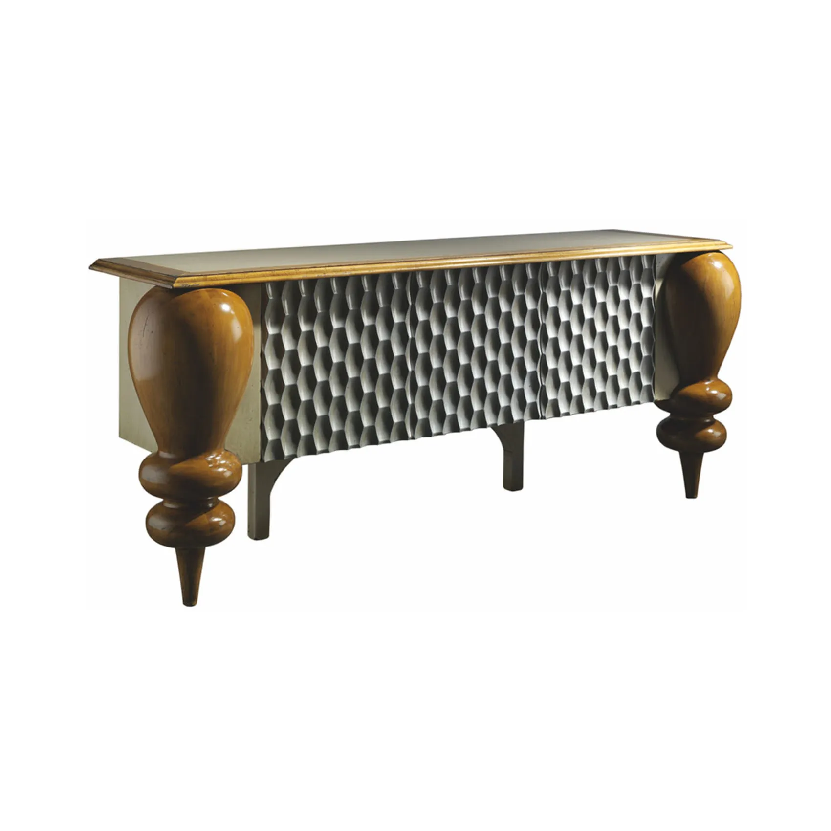 El Aparador Botero L190 de Lola Glamour es una pieza única que fusiona arte, diseño y funcionalidad. Su frontal texturizado con relieves geométricos contrasta con sus elegantes patas torneadas de madera maciza, creando un mueble de carácter exclusivo. Fabricado de forma artesanal y disponible en dos tamaños, este aparador se adapta a diferentes espacios y estilos.