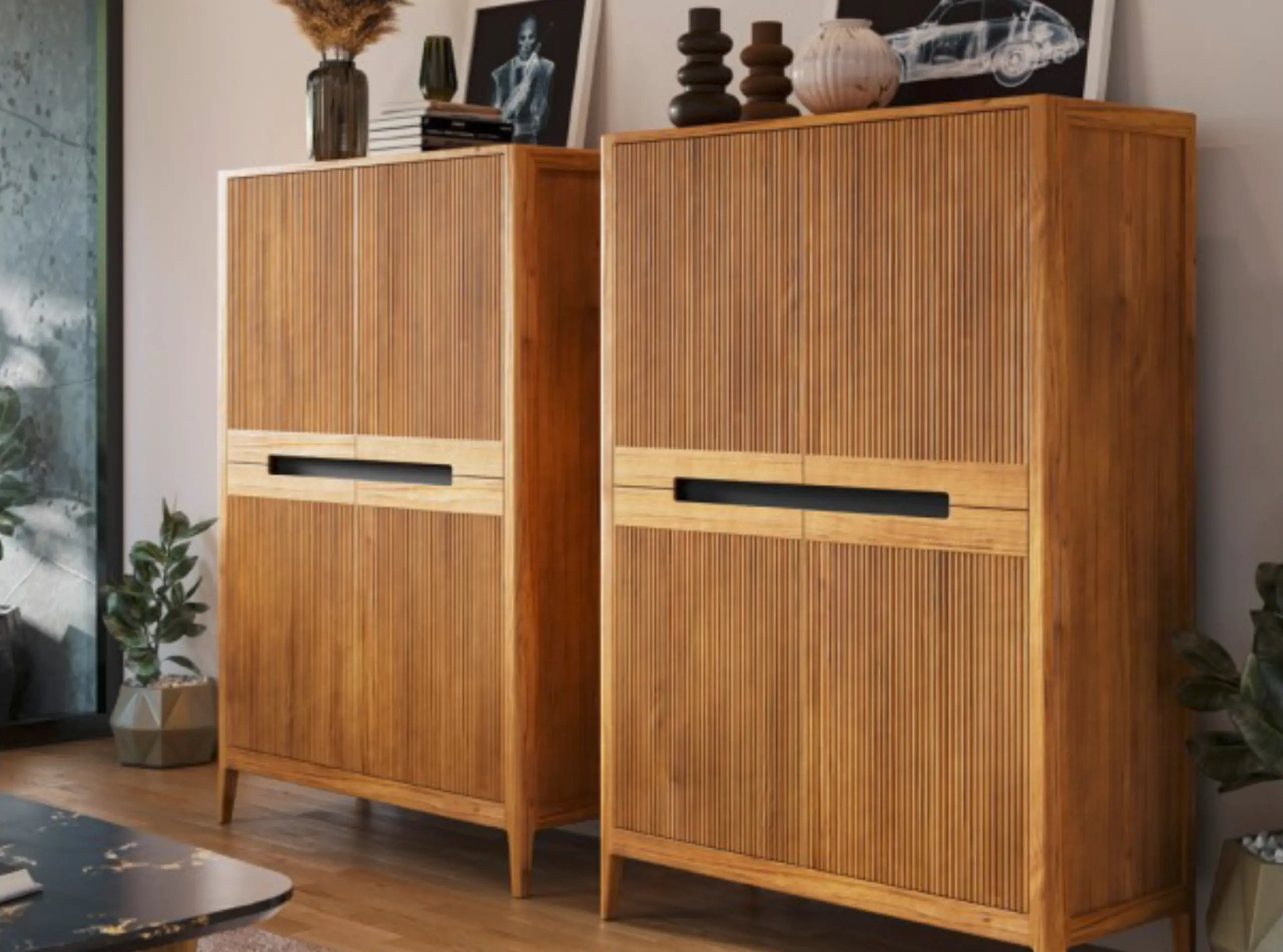 Con un diseño que incluye dos puertas batientes con efecto acanalado y estantes interiores, ofrece un gran espacio de almacenamiento para vajilla, cristalería y objetos decorativos. Además, su acabado personalizable permite adaptarlo a cualquier estilo de decoración.